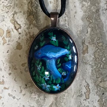 Hand-painted pendant set in glass. From the Midnight Garden series, this pendant measures 1 1/4 by 1 3/4 in.