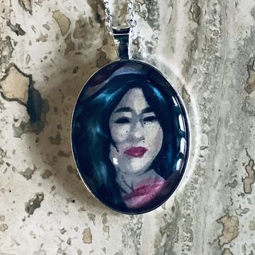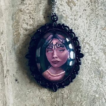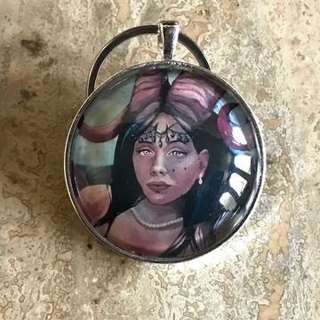 A portrait-close print of my Lady of Decay painting set in glass. 2 inch diameter.