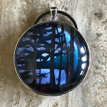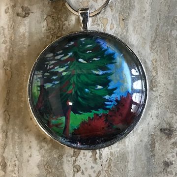 A print of my Pines on Cavendish painting set in glass. 2 inch diameter.