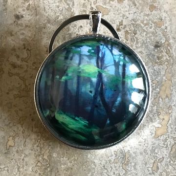 A print of my Forest Dweller painting set in glass. 2 inch diameter.